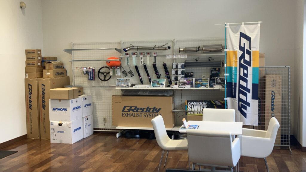 スズキアリーナ鹿の子台とカーセレクションセンター鈴蘭台では、カスタム相談と同時に店頭でGReddyグッズも手に取って選べます。