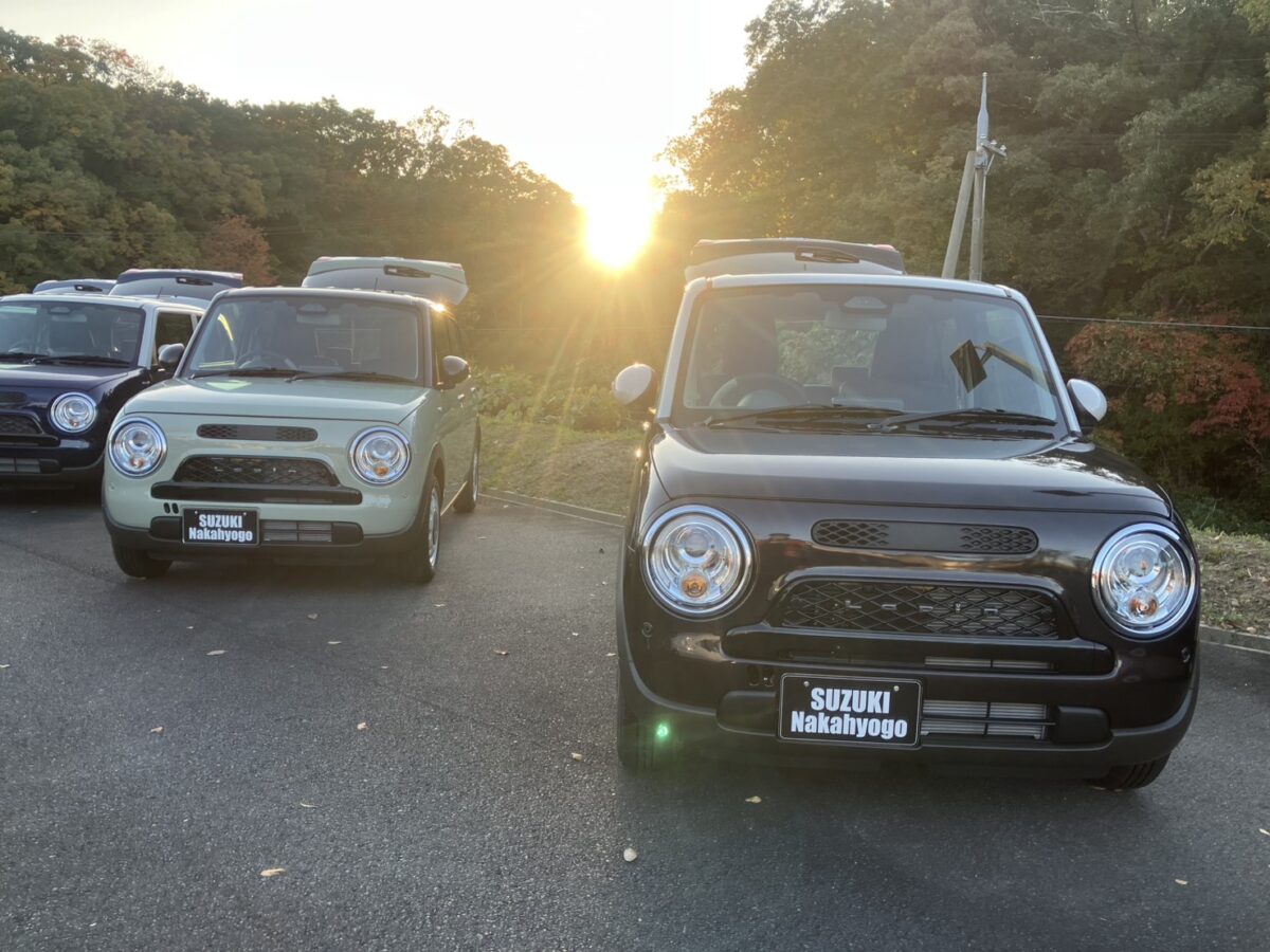 スズキアリーナ鹿の子台店に並んだラパンシリーズが、夕日を浴びてとんでもなく可愛いく仕上がってました…😍✨